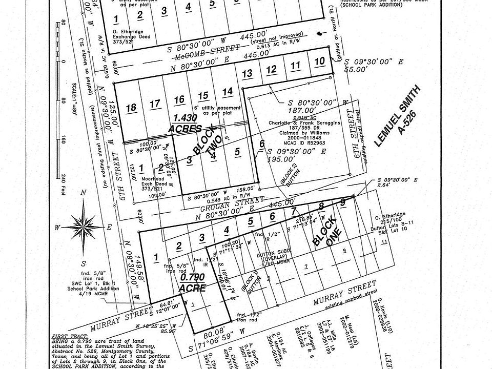 29 Platted Lots in the City limits of Conroe. Praved road frontage on Turner, 6th Street and Murray Street. 4 lots were approved by the City for building duplexes. 3 on Turner and 1 on 6th street. There are a couple of lots on Murray Street that you may be ready for building. Balance of property could possibly be used for multi-family and replatted, Or you may need to put in McComb Street and Grogan Street as these streets are not in. Call the Agent or City of Conroe to discuss. No zoning in Conroe, but there are City guidelines, you would need to verify with the City. Multiple possibilities for this property with all City Utilities available.