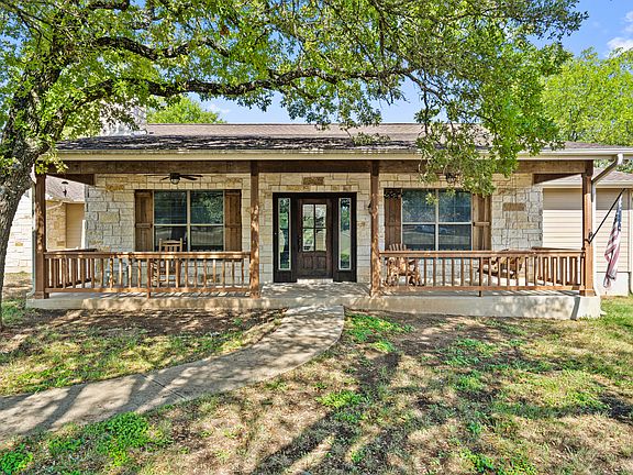 Take advantage of this great opportunity to own a slice of Texas in thriving Liberty Hill. Situated on over three acres, this unique property offers country living with nearby city amenities. A magnificent oak tree adds to the lovely setting of this custom home with its charming front porch, ceiling fans, swing, and rocking chairs which is sure to be a gathering place for unwinding after a long day. Step inside to the large great room with a dramatic stone fireplace showcased by the vaulted ceiling with fans and a wooden beam accent. A built-in desk provides a nice space to work from home. The kitchen is open to the dining area and contains white quartz countertops which contrast beautifully against the rich knotty alder cabinetry and a spacious eating breakfast bar. The oversized walk-in pantry offers plenty of storage. The large laundry/mud room is conveniently located off the garage before entering the kitchen. The primary suite overlooks the backyard and is an ideal retreat for the owner with two closets, one located in the master bedroom and a large walk-in in the master bathroom, double vanities, a soaking tub, and a separate shower. Secondary bedrooms have ceiling fans, walk-in closets, and a shared bath. Low maintenance, stained concrete floors throughout living areas, and luxury vinyl plank in bedrooms. No carpet. Covered back porch, large two-car garage, and three sheds. Plenty of attic storage. The property is completely fenced with a gated entrance. Liberty Hill is a growing community 35 minutes north of Austin.