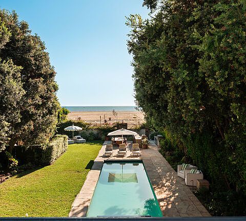 Timeless elegance meets modern coastal luxury in this masterfully reimagined Mediterranean estate. Set on one of the largest oceanfront lots in the area, along Santa Monica's iconic Gold Coast. Once home to Hollywood legend Douglas Fairbanks, this rare property spans roughly 60 feet of coveted beach frontage, uniting rich history with refined contemporary living. Step inside to an airy, sun-splashed living space where ocean breezes flow seamlessly through wide glass doors opening to a private backyard sanctuary. Designed for effortless entertaining and everyday serenity, the outdoor retreat features a sparkling pool and spa, lush green lawn, and multiple areas for dining and lounging beneath the California sky. A full outdoor kitchen complete with built-in grill and wood-fired pizza oven sets the stage for unforgettable gatherings against the backdrop of the Pacific. The chef's kitchen has been artfully redesigned with marble counter tops, premium appliances, including a Wolf range and Sub-Zero refrigerator, complemented by a casual dining nook that invites connection and comfort. There are 2 convenient guest suites located on the main floor, while an elevator ensures easy access to both levels. Upstairs, find another guest suite with a private bath and the stunning primary suite, a tranquil haven with a cozy sitting area, spa-inspired bathroom featuring dual vanities, soaking tub, and walk-in rain shower. Step onto the private ocean-view terrace and take in panoramic coastal vistas and postcard-perfect sunsets. Blending Hollywood heritage with sophisticated seaside living, this re-envisioned oceanfront villa is more than a home it's a rare piece of California's coastal legacy, situated on one of the most substantial beachfront parcels on the Santa Monica coast.