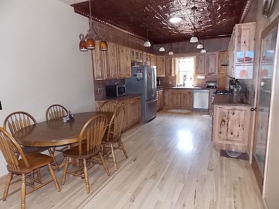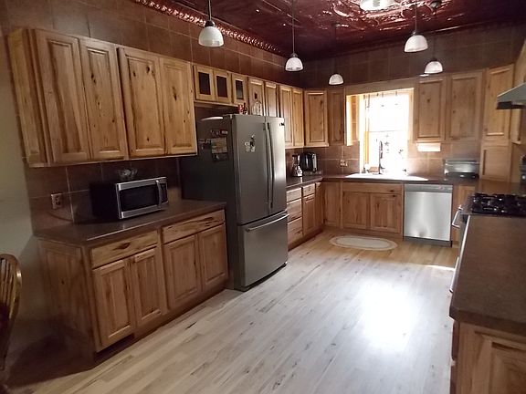 This beautiful historic home was restored in 2008 with new plumbing, furnace, hot water heater & subfloor. Features include stone arches, hickory hardwood floors, knotty hickory cabinets, large laundry room, walk-in coat closet by front door, walk-in closet in master bedroom, claw foot tub and walk-in shower in master bath, stamped tin ceiling in the awesome kitchen and a newly added free standing wood stove in the den. All on an double sized corner lot with underground sprinklers, oversized 2 car garage built in 2009, storage shed, great porch & views of the Mountains.