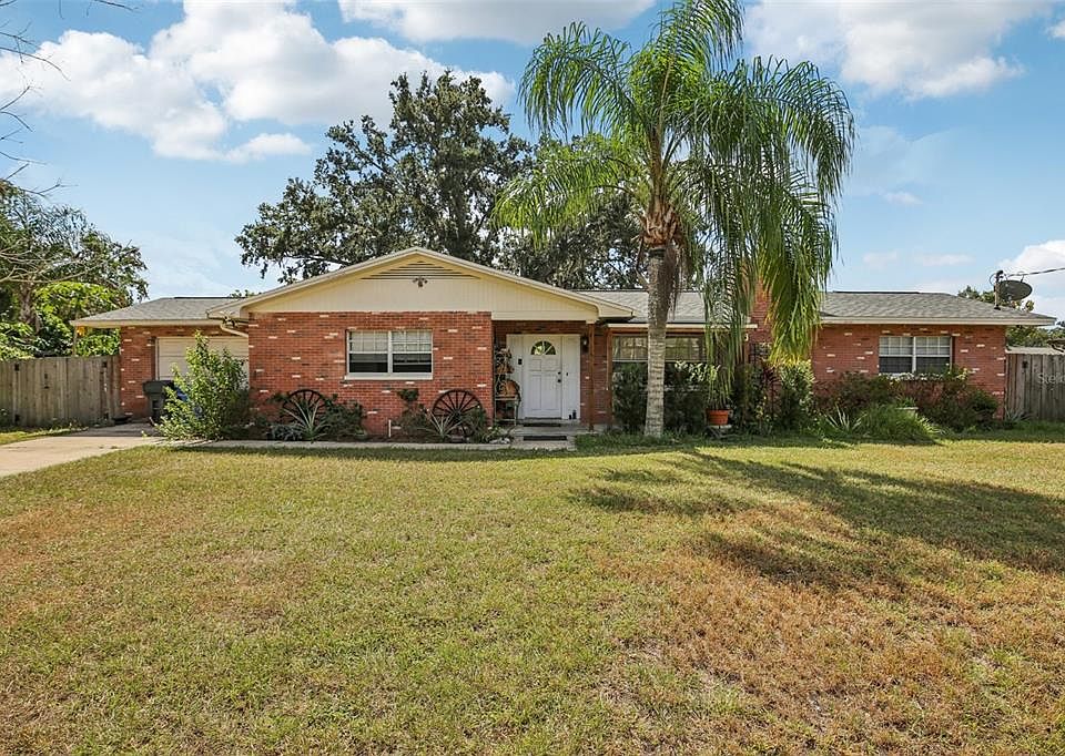 One or more photo(s) has been virtually staged. Welcome to your one-story brick and concrete block home offering space, comfort, and opportunity. This 3-bedroom, 2-bath residence sits on just over a quarter-acre lot, providing privacy, outdoor space, and a long driveway suitable for larger vehicles. Inside, the living area features a cozy fireplace, and the split floorplan allows for flexible use of space. The home offers excellent potential for updates and personalization — part of the former garage has been converted into two additional rooms, ready for your creative vision. Recent updates include a newer roof (within the past 4 years), updated gutters, 2018 A/C, 2019 water heater, and upgraded exterior drainage connected to the septic system. A 10' × 17' shed provides extra storage, and the included water-softening system adds convenience. Enjoy outdoor living on the covered front porch or back patio, or spend time in the backyard, perfect for relaxing or entertaining. The home is located in a friendly, established community with easy access to shopping, dining, schools, and major commuter routes, including a 30-minute drive to Tampa. With no HOA and no CDD, the property offers flexibility and freedom without additional fees. This home combines a solid structure, recent mechanical updates, and the potential for personalization. Schedule a showing today to explore the possibilities this property offers.