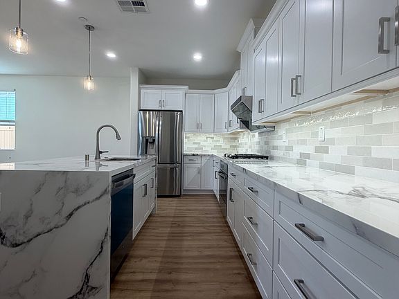 Modern kitchen with quartz countertops, white cabinets, and stainless-steel appliances