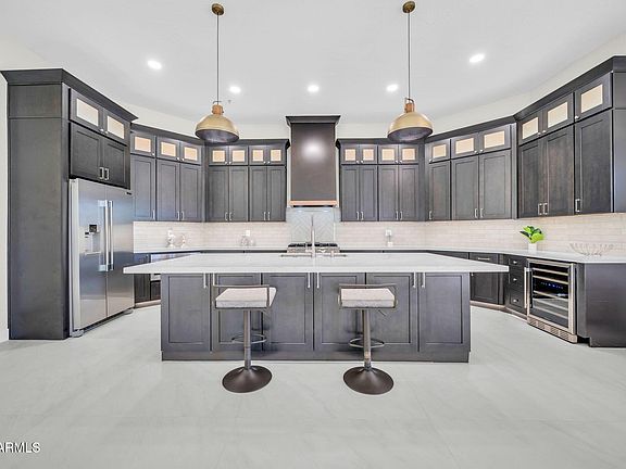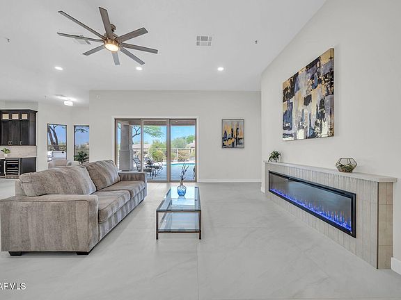 Step into a bright, open floor plan featuring soaring ceilings, designer finishes, and expansive windows that frame picturesque views of the lush desert landscape. The chef's kitchen has been reimagined with custom cabinetry, quartz countertops, and premium stainless-steel appliances, making it perfect for both entertaining and everyday living. The spacious great room flows seamlessly to the private backyard retreat, complete with covered patio spaces—ideal for enjoying Arizona's beautiful sunsets.