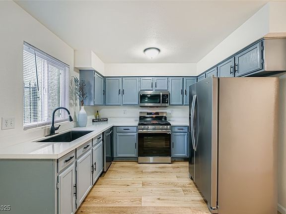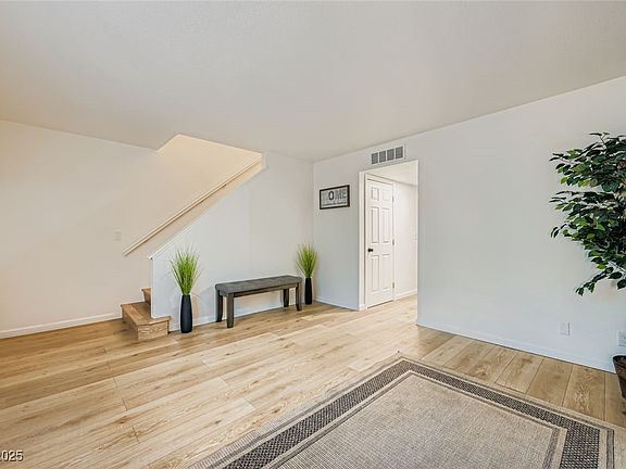 Don't miss this turn key condition townhouse! It was just FULLY renovated with an attention to detail rarely seen at this price point. New luxury laminate flooring throughout, fresh paint, new stainless steel appliances, new sink & quartz countertops, new lighting & hardware, new electric fireplace, full bathroom remodels and more!!! This townhome has balconies with mountain views off of BOTH bedrooms upstairs as well as a gated courtyard off the kitchen with laundry room. Minutes from Nellis AFB and walking distance to Sunrise Mountain, this community has a pool, spa, basketball court and playground. You will be pleasantly surprised by how nice this is!!!