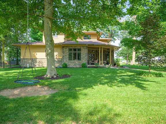 This stunning custom built, Frank Lloyd Wright style home features a striking front porch surrounded by lush, mature trees. You will love the large and open floor plan with plenty of windows to let the natural light flow in. After the foyer there is a lovely den/library/office space great for your collection or working from home. French doors provided additional quietness or privacy. The main level flows to the great room with gorgeous stone fireplace and accent wall. The staircase is the perfect spot for a photo-op and leads into the formal dining area with beautiful light fixture and more large windows. The kitchen boasts custom cabinets with pull out shelving, granite counters, walk in pantry, top of the line appliances, huge island & 10' ceilings throughout. The main floor primary suite has double sinks, walk-in shower and custom closet with laundry area. Perfectly placed mud room with custom built in desk, and cabinetry. Upstairs includes entertaining area, 3 bedrooms, 2 have attached bathrooms of their own and a bonus/ rec room! There is no shortage of space in this large home! This home was built with lots of storage space in mind and the natural lighting leaves it feeling light and airy. The backyard features a shed with electric, air and heat. Newer fencing and a great area for a fire pit. 3 car garage with plenty of storage. Furnace is 6 months old and includes a water softener with reverse osmosis in the kitchen.