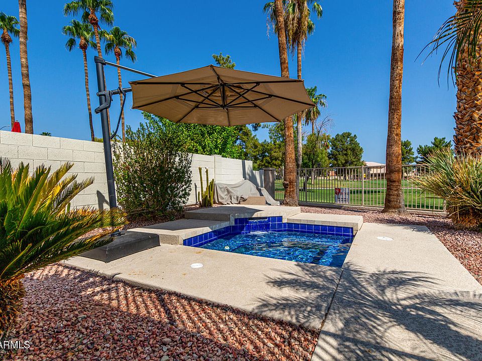 Discover this well appointed home located in the Arrowhead Ranch community. Enjoy your private backyard retreat complete with an in-ground spa, surrounded by mature landscaping with views of the Arnold Palmer designed golf course. The primary suite opens to a private balcony overlooking the course. This spacious home is ready and