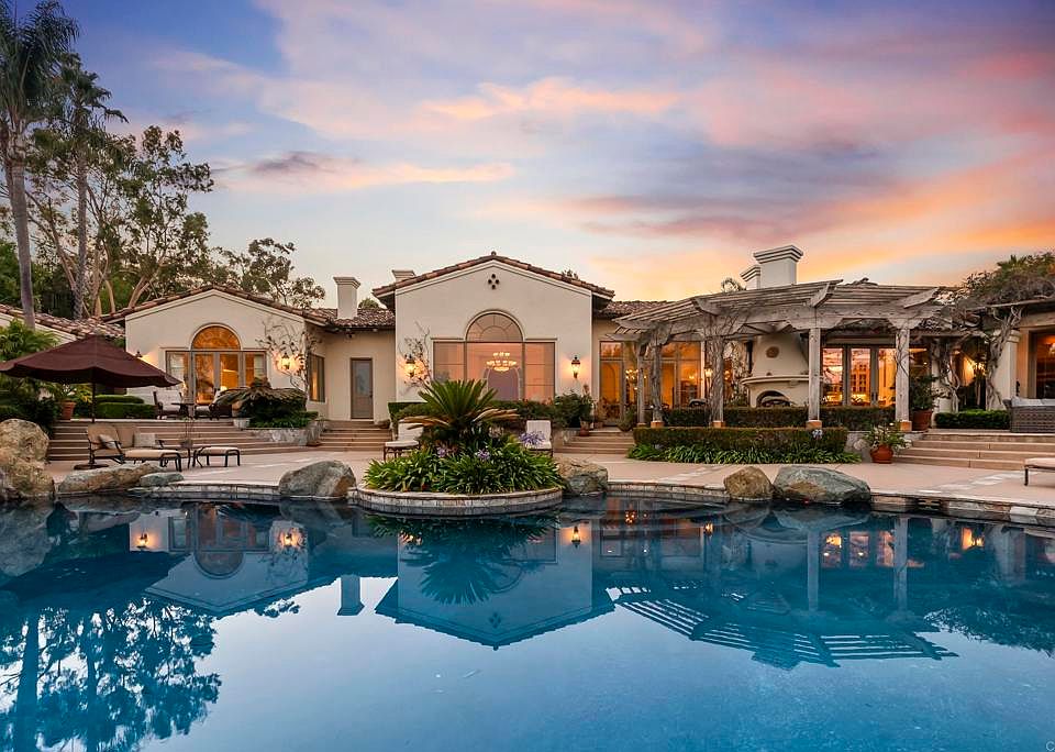 Welcome to 7057 Rancho Cielo, a stunning single-level estate perfectly positioned in the prestigious Covenant of Rancho Santa Fe. Encompassing over three serene acres, this architectural treasure captures uninterrupted southern mountain views and offers a lifestyle defined by privacy, elegance, and effortless California living. Behind a private gated entry, a long circular driveway winds through manicured gardens, setting the stage for the refined residence within. Spanning 8,424 square feet, the home offers both formal and informal living and dining spaces, designed for seamless entertaining and everyday comfort. Walls of glass invite natural light and frame pastoral vistas, while a 160-bottle climate-controlled wine room with adjacent bar elevates gatherings with friends and family. Five bedrooms and seven baths, plus a detached 432-square-foot casita currently outfitted as a gym, provide versatile accommodations for guests, work, or recreation. Outdoors, the resort-style grounds inspire connection and relaxation with a vanishing-edge pool and spa, covered outdoor kitchen, multiple lounge and dining areas, and a charming family orchard. All of this is set within minutes of the Rancho Santa Fe Village, award-winning schools, and world-class golf, making 7057 Rancho Cielo not just a home, but a statement in luxury and the art of single-level living.