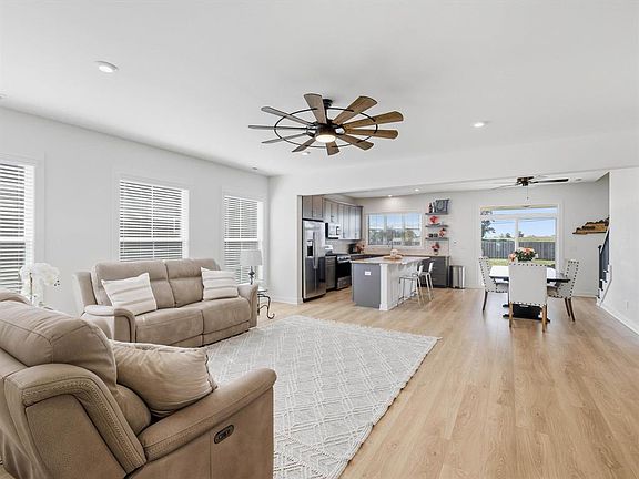 Covered back porchLight-filled kitchenStainless steel appliancesTile backsplashStone accentsBoard-and-batten sidingOpen floor plan