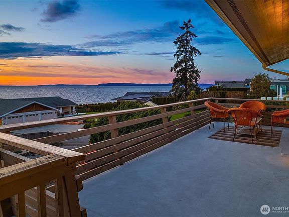 Sweeping Sound, Olympic, & Whidbey views from this 4-bed coastal daylight rambler in Edmonds. West-facing wall of windows fill the home w/ natural light & frame the vistas. Airy living room flows effortlessly into dining & kitchen. Hardwoods throughout. Gas fireplace. Step outside to expansive wraparound view deck—perfect for sipping wine as the sun dips into the Sound. Thoughtfully designed for indoor-outdoor living, surrounded by lush landscaping. Timeless finishes & updated kitchen. SS gourmet appl: Wolf & Sub-Zero, granite counters w/ breakfast bar. A/C. Spacious Primary Suite w/ 5-piece bath & skylights. Solar panels add efficiency. Lower-level storage rm, 2-car attached garage, 2 private driveways, roaming backyard & tidelands.