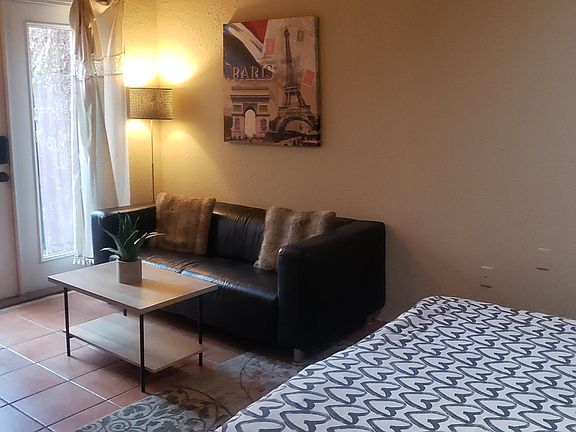 Fully furnished with Queen bed, sofa, coffee table, Smart TV, desk and chair, large closet. Front french doors look out on beautiful patio and historical neighborhood. Gated with Keypad entry.