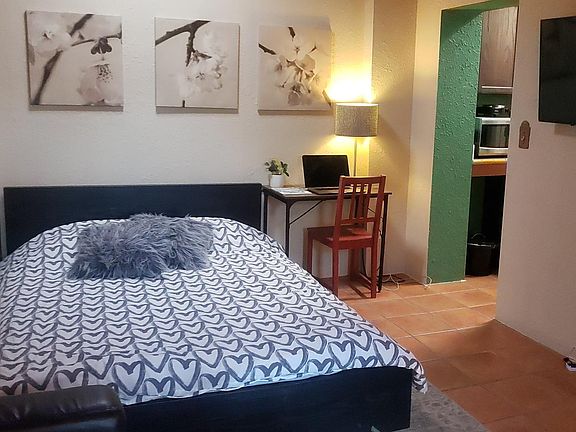 Spacious fully-furnished loft-like Casita with high ceilings, in-unit laundry and large fenced private patio in highly desired Historic West University Neighborhood close to shops and reataurants and 1 block to UofA.