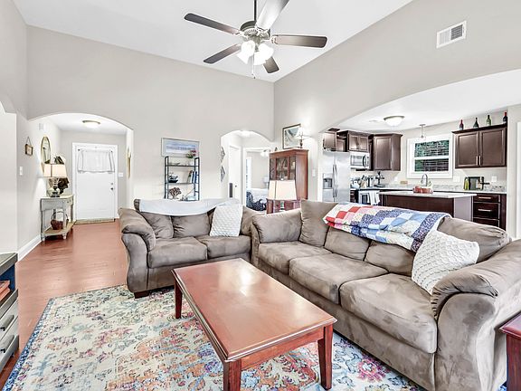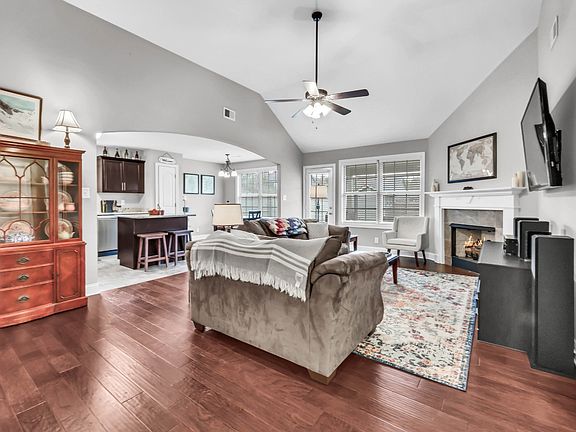 This single-owner home combines thoughtful design and modern finishes throughout. Step through the arched entryway into a welcoming living room featuring a vaulted ceiling, gas fireplace, and open floor plan—perfect for everyday living and entertaining alike. The kitchen impresses with granite countertops, ceramic tile flooring, stainless steel appliances, a center island with bar seating, and a pantry for extra storage. The eat-in dining area overlooks the backyard for easy indoor-outdoor flow. The primary suite features a double trey ceiling, spacious walk-in closet, and private bath with a double vanity. You’ll love the convenience of a real laundry room and the extra storage available with pull-down attic access and garage shelving that conveys. Enjoy outdoor living in the privacy-fenced backyard with a covered patio and 8x8 storage shed that perfectly matches the home. Meticulously maintained by the original owner (with no pets)—just move in and relax!