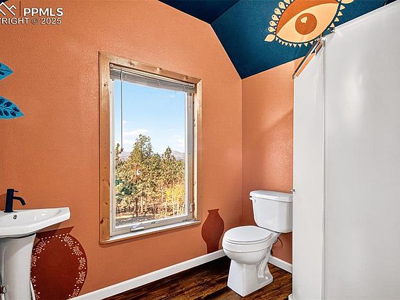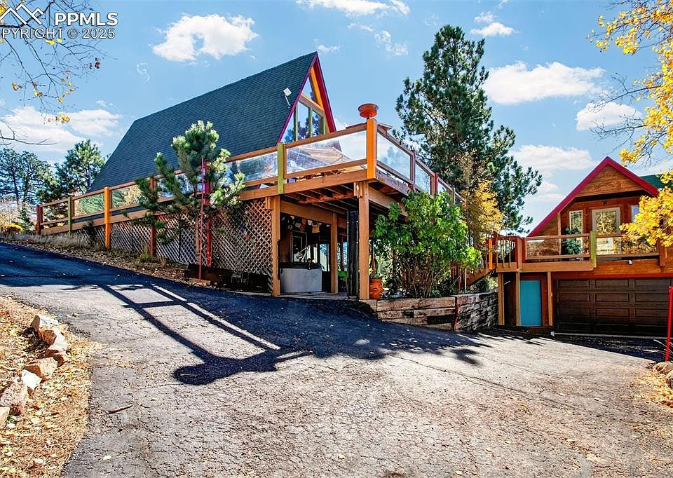 Discover the perfect blend of classic mountain retreat and practical self-sustainability with this charming 1587sgft A-frame home, nestled on a private 2 acre lot. Located less than 20 minutes from the amenities of Woodland Park, this property offers a peaceful escape with easy access to town. Step inside to experience the classic cabin atmosphere. The heart of the home is the spacious great room, featuring vaulted ceilings, warm stained wood floors, and abundant floor-to-ceiling windows that flood the space with light, providing beautiful views—including a peek of Buffalo Peak—and a passive solar benefit. The well-appointed kitchen features built-in pantry cabinets for ample storage. A flexible loft space overlooks the main floor, perfect for use as a second bedroom or a bright flex space. This home offers layered and efficient heating for ultimate mountain comfort, including a gas furnace downstairs, a thermostat-controlled pellet stove upstairs, and high-efficiency hydro-electric baseboard heating for supplemental or backup warmth. A standout feature is the separate 720 ft.² studio apartment above the garage, complete with its own tank-less water heater, ideal for guests, rental income, or a private office. For reliable mountain living, the home is equipped with a 1200 Watt natural gas/propane generator looped directly into the house for essential standby Power. Outdoor practicality is key: the property includes a paved pad for RV/extra parking and a fenced side yard suitable for a garden or pet area. Don't miss the chance to own this private, self-sufficient mountain haven that truly offers the best of cabin charm and modern convenience.