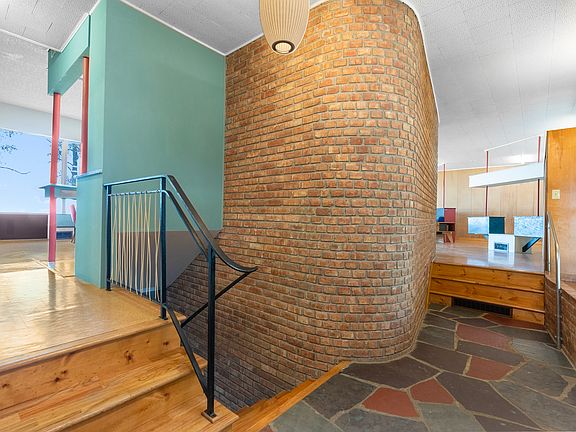 Architectural detailsSemi-circular drivewayColorful innovative materialsViews for milesExposed interior brickTons of storageBeautiful wood paneling