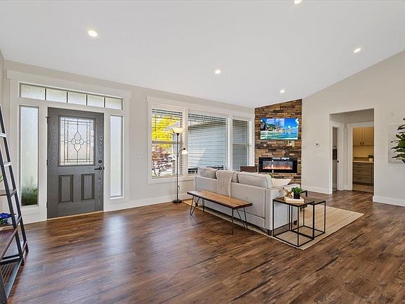 Pristine 3 bed/2.5 bath home in an established neighborhood with lots of amenities. Built in 2019, this lovely 1,601 square foot main-floor living home boasts cathedral ceiling, LVP floors, electric fireplace with floor to ceiling stone, kitchen island with eating bar, quartz counters, painted cabinetry, full subway tile backsplash, and upgraded, wide trim. The primary suite offers both a soaking tub and tiled shower, double sinks, quartz counters, and a walk-in closet with barn-style door. Outside, there is an automatic sprinkler system and the large, east facing patio is covered, featuring recessed lights and steps down to a slab with power setup for a hot tub. The large backyard is fenced and has a garden shed. Along the side of the home, there is a double-gated fence with additional parking for an RV with FULL RV HOOKUPS…water, power, and even a dump station! Hi-efficiency gas furnace, central A/C, and gas hot water. No HOA or CCRs.