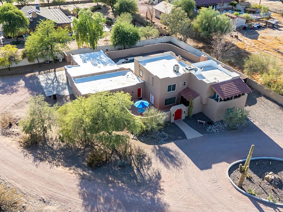 NO HOA! Amazing, Custom 4 bed / 2.5 bath home with loft on 2.1 acres offering amazing Superstition Mountain views! Built with 8'' block walls, this open floor plan features vaulted ceilings with exposed wood beams, an updated kitchen, and abundant windows for natural light and stunning views. Home office or guest suite adds flexibility. Enjoy the nice backyard with a massive, covered patio, outdoor fireplace, and a recently resurfaced Pebble-Tec diving pool with dedicated pool bath. 6-car garage provides plenty of space for RVs, ATVs, w/separate 1 car garage/storage area. No HOA. Newer roof. Formerly a successful AirBnB—ideal for investors or large families looking for privacy and space. Roof recoated in 2024 & ac units are new in 2019 and 2024. Newer dual pane windows. Gated entry. ... separate 1-acre buildable lot in front. Each one has its own parcel number. Possible guest house or RV shop.