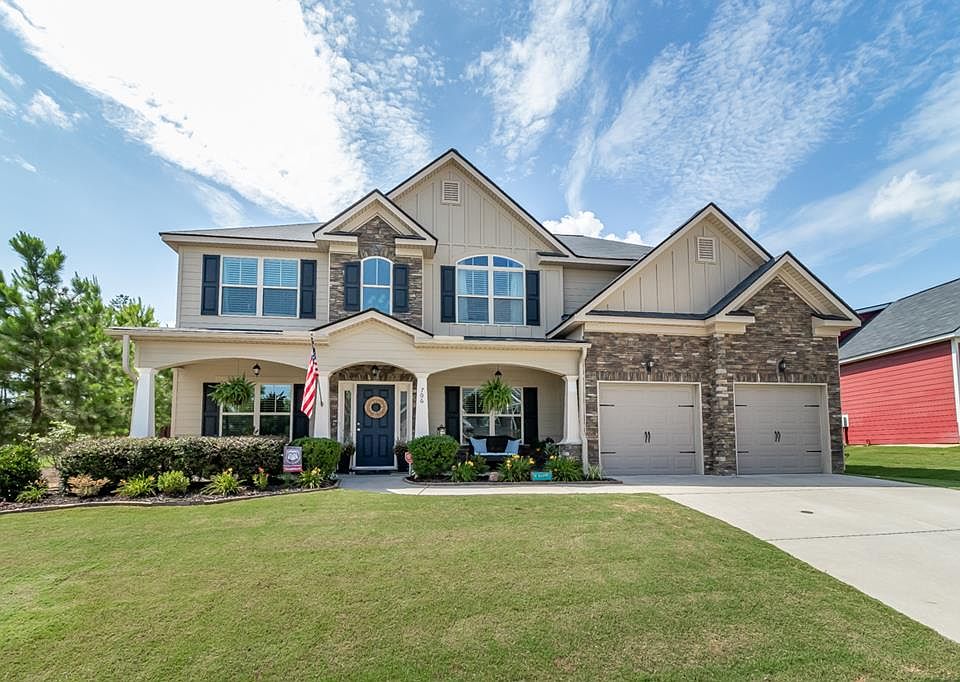 Stunning Nantucket Plan Home like new. Features beautiful landscaped front and back yards with storage in back yard and privacy fence. Open floor plan includes lots of natural lighting with a guest suite on main floor with office, dining room, great room that open to screen in back porch and spacious kitchen with pantry and island. Dining area has built in butler counter. Large Master Suite with sitting area. Hardwood floors in all common areas. Gourmet kitchen with granite and tile backsplash, Stacked stone fireplace with HDMI wiring, designer tile shower and granite countertops in Master bath. Owners upgraded lights on main in common area to be canned lighting. Home is on a corner lot and nestles next to 25 ft of common area on one side. Separate attached double car garages. Landscaped yards with new plants. Floating deck added with outdoor firepit, screen in back porch with pergola and a nice storage building that remains. MUST SEE TO APPRECIATE. Virtual Tour for viewing.