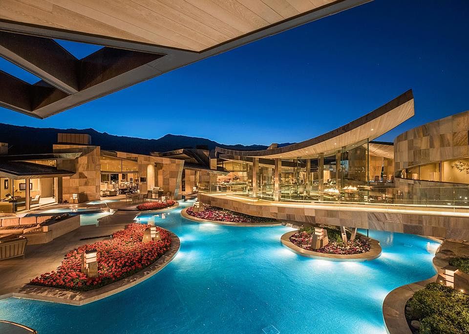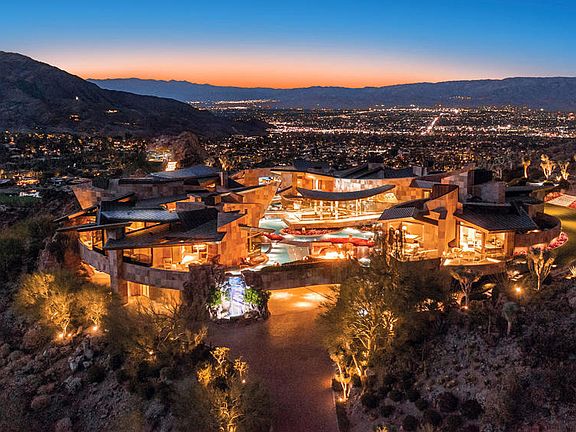 Welcome to the most breath-taking property in the Coachella Valley. Unparalleled in design, this sprawling estate has been organically constructed into a summit hilltop, offering unobstructed views of the entire valley. Intricately designed with stunning pools of water throughout, staggering mountain and valley views are enjoyed from every room of this home. Created by renowned architectural designer Guy Dreier, this home was recognized as Robb Report's Ultimate Home of the Year, and remains as relevant today as its first day of completion. An open-air glass elevator sets the tone upon arrival. Retractable walls of glass create the quintessential indoor outdoor living. Mirroring the natural terrain, the home features overlapping planes of copper and titanium. Curvilinear walls form asymmetrical pavilions, incorporating all sun exposures for the ultimate in outdoor living. The perfect selection of exotic woods, slab surfaces and custom rugs are orchestrated to create this stunning masterpiece of warmth and drama. The gracious living room includes a titanium-clad fireplace, wood ceilings, custom furnishings, sit-down bar and views of BIGHORN and the Santa Rosa Mountains. A warm dining room is easily accessed through an impressive aquarium walkway, comprised of titanium flooring, 3 tanks of exotic fish and rare sharks. The master suite is the epitome of luxury, with panoramic views, outdoor lounge area, private outdoor spa and fireplace. Golden Onyx slabs are back-lit and book-matched throughout the bedroom and bath areas, with separate boutique-style closets, vanities, office, exercise room, tub, shower and direct access to a private pool. In addition, the main residence has an additional sumptuous guest suite, staff quarters, catering kitchen, extensive storage, kennel, private owners' garage and guest garage. The guest pavilion contains four expansive bedroom suites, kitchen and living room, with direct access to pools, pavilion and sport court. The infamous private office is perched high into the rocks and sits on a plateau with unobstructed stunning views of simply everything. Intertwining sculptural pools offer a one-of-a-kind swimming experience. The outdoor pavilion is self-contained with living room, kitchen, bathroom, fireplaces and retractable electronic glass walls to protect from rare cool desert nights. This estate has no equal. Sitting on nearly 8 acres, furnishings included, you can own your own private resort within BIGHORN Golf Club.
