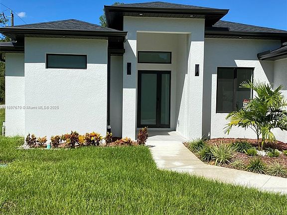 Brand-new corner home! This 3-bedroom + den, 2-bath property sits on a ¼-acre lot and features high ceilings, open layout, and plenty of natural light. The primary suite offers 2 walk-in closets and a spa-style bath with, shower, freestanding tub and double vanity. Modern kitchen with quartz countertops, backsplash, and stainless steel appliances. The living area includes built-in ceiling speaker that connect via Bluetooth — perfect for entertaining. Laundry room with washer, dryer, and sink included. The two-car garage has an epoxy-finished floor and an automatic door. Tile floors throughout, impact windows and doors, lanai prepped for outdoor kitchen, smoke detectors and sprinkler system. Close to schools, parks, markets, RSW Airport, Fort Myers, and Gulf beaches.