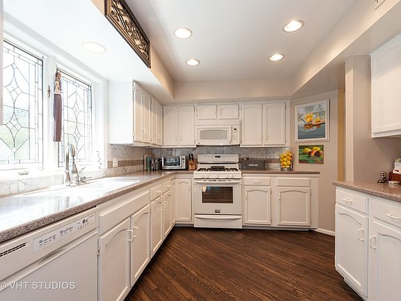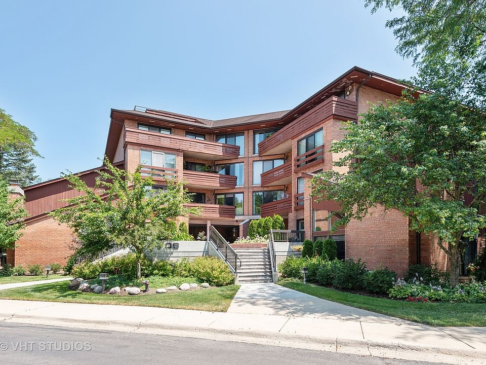 End unit townhome offers separate & convenient access from the exterior. Light filled cathedral ceiling living room with fireplace in desirable Orchard Glen. Main level features separate dining room, updated all white kitchen with sliders to patio. Hardwood floors, master bedroom with sliders to deck. Attached heated garage with space next to the unit door, ample exterior guest parking. New furnace Feb. 2019. Pool & pool house, lobby has party room. Great location to grocery shopping, restaurants, library & Metra train.