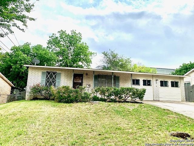Welcome to this four bedroom, two bathroom single family ranch style home nestled in a prime location. This home built in 1971, makes this home one of the youngest in the area and has four sides of brick. The kitchen boasts stainless steel appliances and a refrigerator included. The primary bedroom is strategically situated off the kitchen, providing a sense of privacy and separation from the additional two bedrooms and bathroom. The garage has been closed in and can be used as a 4th bedroom, exercise room or can easily be converted back into a garage if desired. The primary bathroom has been recently updated and wood flooring has recently been installed in the two bedrooms. Need more space there's a storage building in the back yard. The elementary is walking distance. This home has so much potential. While some minor repairs and updates may be desired, the possibilities are endless to customize. Conveniently located in Dellview neighborhood with easy access to downtown San Antonio, medical center, and many restaurant options. Your perfect starter home awaits you!! Call and schedule a showing!