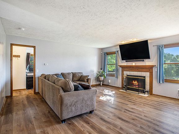 Where to begin with this well maintained ranch with finished lower level walkout on over 10 acres. The home is lovely and spacious with luxury LVT wood flooring throughout. The kitchen features quartz countertops, a farmhouse sink and newer appliances. There is a large deck off the kitchen. The primary ensuite has a walk-in closet and it's own balcony. Downstairs you'll find a second family room and 2 more bedrooms and another room for your office or play room. All with new carpet. But for those looking for a pole barn, this is it! The barn is wired 220, has concrete floors and is heated and cooled with a minisplit. This location is just beautiful and you should enjoy lovely evenings around the firepit enclosed by a swingset pergola with wooden swings, projector tv, and lights. Security system for house and barn, new water softner, attached 2+ car garage and so much more! Call Angela for your private showing before this one gets away!