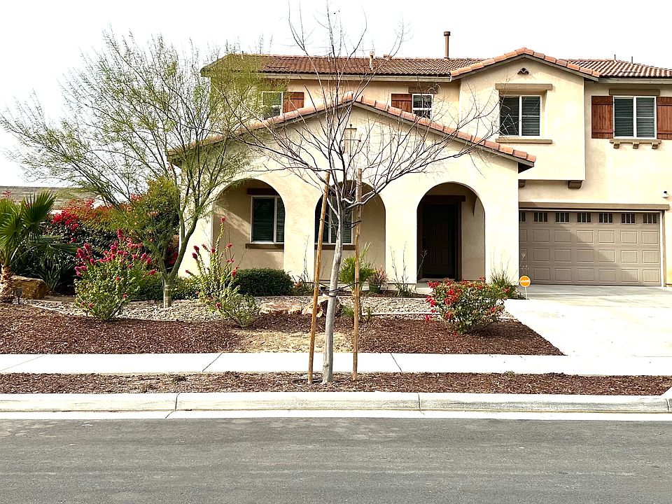 The home built in 2018 is move-in ready! The property is well-maintained and loved by the current owners. They added a large gazebo and many fruit trees (pomegranate, avocado, lemon, limes, and cuties). This home has five bedrooms. A guest suite is conveniently located on the main floor, with a walking closet and an ample bathroom. A half bathroom is located downstairs. The upstairs has a primary bedroom with a large bathroom, separate bathtub and shower, and a large walk-in closet. Three more bedrooms and an ample bathroom are located upstairs. Large formal entry, large upstairs loft with a linen/coat closet. The living and dining rooms, with an open floor plan downstairs for entertaining, make this home very inviting! Energy-efficient appliances include a washer/dryer, dishwasher, refrigerator, cooktop/oven, microwave, tankless water heater, and Reverse Osmosis and alkaline water filter in the kitchen for drinking and cooking. The garage is EV-ready for your electric cars! The home has fully paid solar panels that will save on your electricity bill. Luxury vinyl flooring in the living areas and the guest suite were recently installed. The house has plenty of closet space under the stairs for extra storage. The kitchen has a walk-in pantry. This home is near numerous amenities and a short drive to the University of Riverside, UCR Medical School, Loma Linda University and Hospital, and VA Hospital. No smoking in the house. The tenant pays for electricity, gas, trash, internet and water. The owner pays for HOA, Gardener, and the alarm is negotiable.