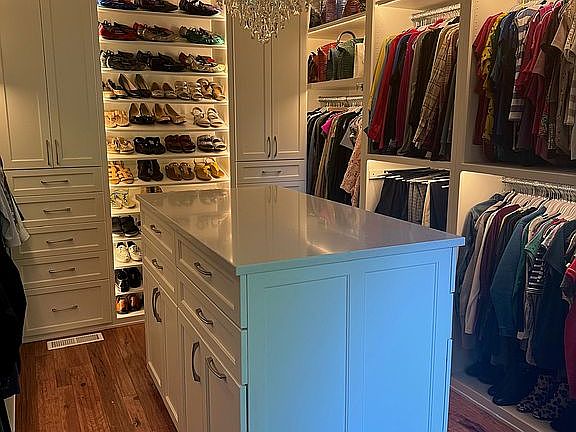 Discover a truly one-of-a-kind primary closet, meticulously custom-built by skilled Amish craftsmen. Every detail has been thoughtfully designed to provide not just storage, but a beautiful showcase for your wardrobe. With handcrafted woodwork and exquisite attention to detail, this closet is more than just a space—it’s a testament to timeless craftsmanship and custom luxury. This glamorous walk-in haven features rows of custom shelving for shoes, a large island with quartz countertop, and a layout that feels straight out of a magazine.