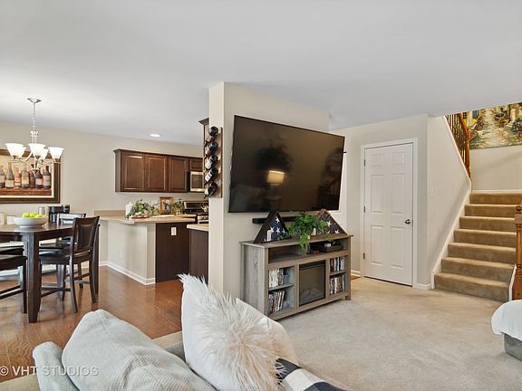 This beautiful, better than new townhome located in the highly desirable Country Club Hills subdivision has been meticulously maintained, and is ready for you to move right in! The welcoming two-story foyer and split oak staircase features iron balusters and creates a warm and inviting entry into your new home. Fabulous floor plan offers a nicely sized great room and opens to a large, bright eat-in kitchen. This chef's paradise features Aristokraft custom cabinetry, pretty countertops w/double sink, all Whirlpool stainless steel appliances including a 4-burner gas oven/range, refrigerator (2018), dishwasher & microwave, and hardwood flooring. You will appreciate the additional cabinetry and dry bar area great for serving, as well as the separate pantry closet which offers storage galore! The dining area features a large sliding glass door to your own patio with open space views and custom window treatments & hardware to complete this amazing main level entertaining space! The 2nd level primary suite features his and hers walk-in closets, newer window treatments & hardware, ceiling fan (2020), luxe bath offering a large soaking tub, separate shower and double vanities. Additionally on the 2nd level are two more bedrooms with tasteful window treatments & hardware and large closets, as well as the recently updated (2021) dreamy laundry room with decorative wainscot wall trim, custom butcher block folding counter, built-in cabinetry w/hanging area and fresh new paint. The main level powder room, also recently updated (2021) includes fresh paint, new flooring, new toilet & new vanity. Attached 2-car garage with direct entry has been finished (2020) to include storage shelving & TV mount, and a Chamberlain wifi enabled garage door opener. Great energy efficient home offering a 68 HERS rating, per builder 2017. Enjoy living just steps to nature along the Nippersink Community Park, close to the Chain-O-Lakes State Park, local shops, schools, and good proximity for commuters to the Fox Lake Metra Station. This is the one you have been waiting for!