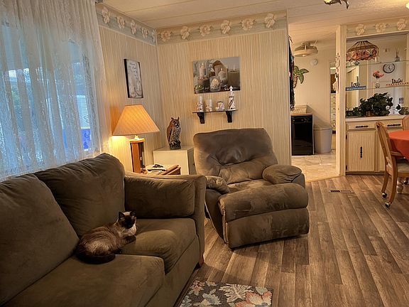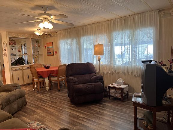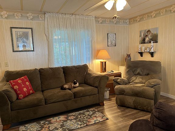 Immaculate & updated 14' Wide singlewide in Ridgeway, all ages community in Hobe Sound. This home has so much living space w glassed in lanais on both sides of the home. The Charming front porch leads into the sunny Lanai w ceramic tile floor & sliding glass windows. From there you enter into the living Room w new laminate flooring & windows galore. The front Bedrm has a built in desk area w cabinets & a door to the guest bath w new vanity, chair height toilet & step in shower. The LR is open to the large kitchen & has another dining area. The kitchen is spacious w ceramic tile floor & a slider out to 2nd lanai. The Master Bedrm is large w King bed & light & bright & remodeled bath. New A/C 2016, metal roof sealed in 2016. Huge shed/workshop. Great back patio. Won't last. Furnished as seen
