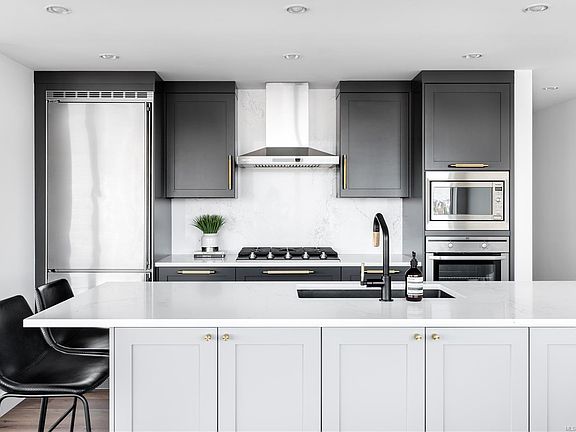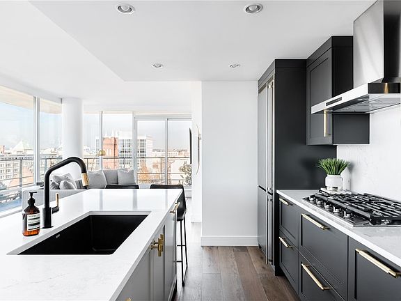 The most refined and design-forward offering currently available at The Falls. This is 1105, a corner, harbour-sunset-facing 2-bedroom + den, 2-bath, in-suite storage room, and nearly 1,200 sqft of magazine-featured interior space. This custom residence stands apart with 250k of tailored upgrades and bespoke detailing throughout. Fully reimagined in 2021 with curated materials: real wide-plank walnut hardwood floors, custom Thomas & Birch kitchen millwork, quartz countertops, Buster+Punch hardware, and updated appliances. A modern fireplace anchors the living space, framed by in-set LED wall lighting. Functional updates include new heat pump w/ AC, new full-sized laundry, and two-layer blackout blinds in each bedroom. A true turn-key home w/ high-end furniture included and exclusivity to upscale amenities - pool, hot tub, and gym. Located steps from Victoria’s best dining and cultural landmarks, Unit 1105 is a rare blend of unique & timeless design, function, and lifestyle.