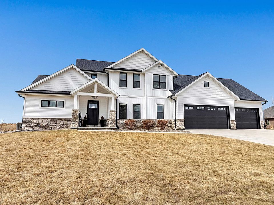 Welcome to this breathtaking contemporary 2-story home, designed w/modern elegance & functionality. Featuring 5 bedrooms, 2.5 bathrooms and an open-concept layout, this home blends luxury & comfort. The first-floor Primary Suite boasts a spa-like en-suite w/a soaking tub, dual vanities and a walk-in tiled shower. The chef’s kitchen features stainless steel appliances, granite countertops, a large island, a butler’s pantry w/extra refrigerator and a beverage bar. The living room shines w/soaring ceilings, a floor-to-ceiling stone fireplace and expansive windows. Upstairs offers four bedrooms all w/walk-in closets and a stylish bath. A heated 3-stall garage, covered patio and recessed soffit seasonal lights complete this must-see home! 48 hrs binding acceptance.