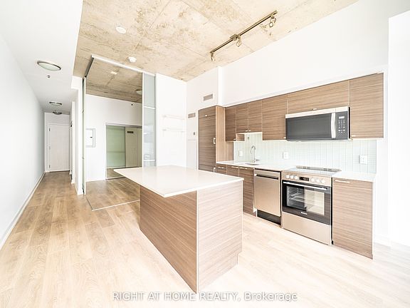 Explore the interactive virtual tour for a complete walk through of this upgraded loft style suite. This open concept 1 + den condo features nine foot exposed concrete ceilings, new floors, stainless steel appliances, caesar stone counters, a glass backsplash, and a custom kitchen island with storage. The bedroom has a sliding glass privacy door and a full mirror closet. The den offers valuable flexible space that works well as a home office or reading nook. A private outdoor entrance and spacious patio expand your living area and provide an ideal spot for morning coffee or evening downtime. Upgrades include a new walk in shower, new bathroom closet and baseboards, a new double deep kitchen sink, a new patio door window, and fresh paint. The fridge, stove, dishwasher, and microwave are brand new. The washer and dryer are one year old. 707 Lofts is a five storey boutique residence known for loft inspired layouts, floor to ceiling windows, and efficient designs suited to a modern live work lifestyle. Amenities include a party room and well maintained common spaces.**Parking and locker included.** Located steps from Bloor Street West and Bloorcourt Village, the neighbourhood offers cafes, restaurants, bars, and boutique shops. College Street and Little Italy provide even more dining and nightlife options just south of the building. Transit access is excellent with Ossington Station close by. Palmerston Little Italy is a mature and vibrant community with tree lined streets, character homes, and an energetic local atmosphere.