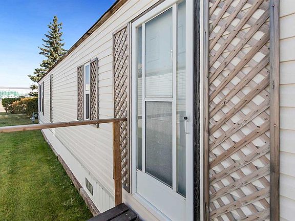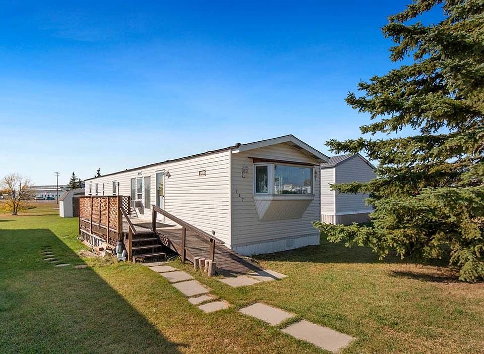 Welcome to this comfortable and WELL-KEPT 2 BEDROOM, 1.5-bath mobile home on an OWNED LOT BACKING ONTO GREENSPACE. Ideal for first-time buyers or those looking to downsize, this home offers a bright, airy layout with VAILTED CEILINGS, a brick feature wall, and plenty of natural light from the bay window and patio door. The primary bedroom features a walk-in closet and 2 PC ENSUITE (can add tub/shower), while the second bedroom is conveniently located near the 4 PC BATHROOM. There's also a window A/C for comfort. Step outside to a spacious front deck with stairs and a wheelchair-accessible ramp, DRIVEWAY PARKING, and a large 10’ x 12’ SHED perfect for storage. The peaceful backyard offers room to relax, garden, or just enjoy the open views behind you. Located in CARSTAIRS, this affordable property is a fantastic opportunity with flexible showing availability. Book your private tour today!