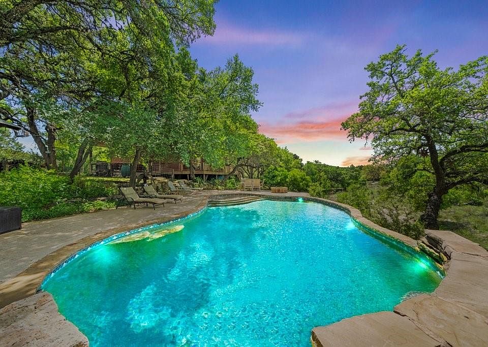 Sparkling poolSeasonal creekMajestic oaksHardwood flooringIpe hardwood deckingQuartz countertopsImpressive floor-to-ceiling fireplace