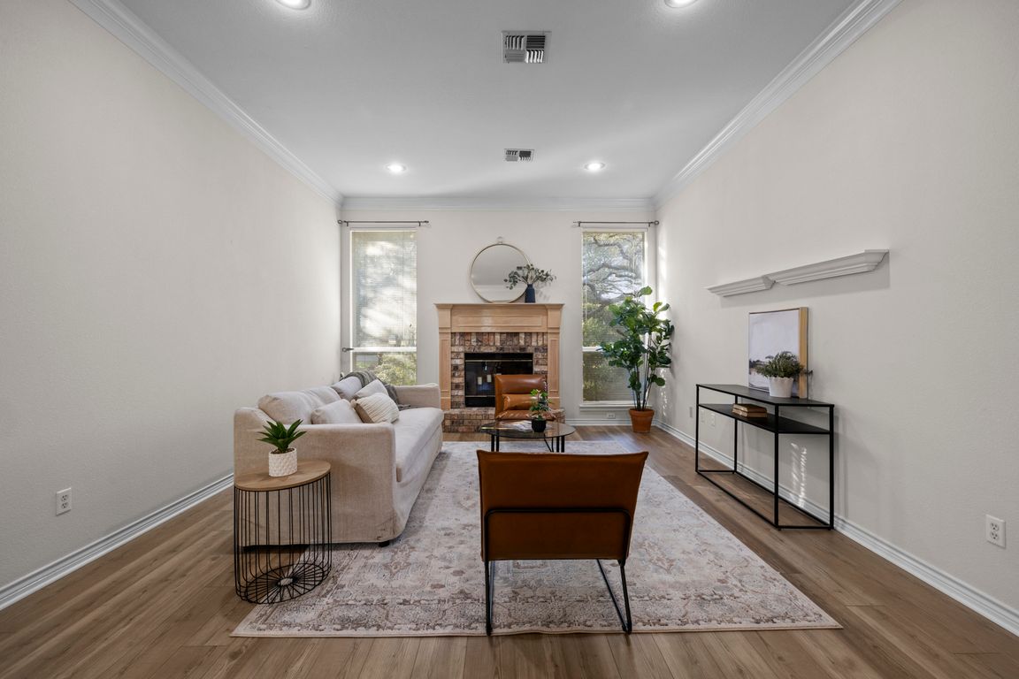 Lush native landscapingMature treesCustom built-in cabinetry