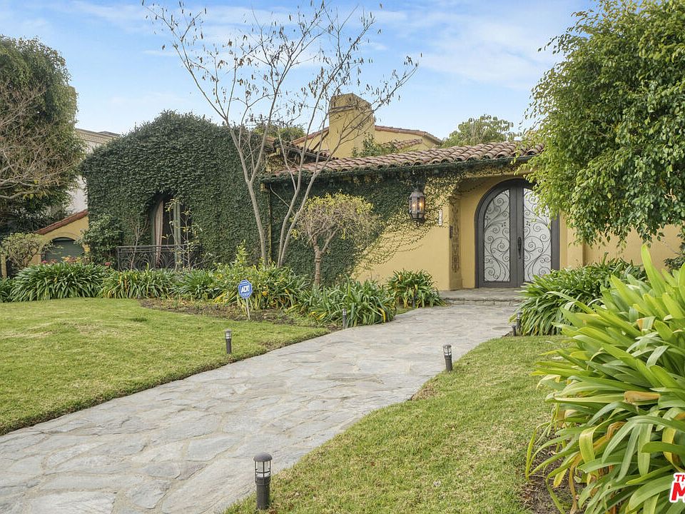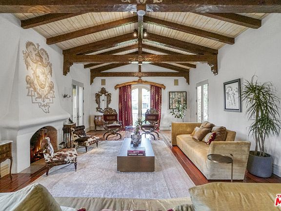 This exquisitely restored 1920s Spanish retreat is located in the prestigious Flats of Beverly Hills, seamlessly blending timeless elegance with modern luxury. Gleaming hardwood floors and high ceilings, many with intricate beamed designs, flow throughout the home, highlighting its authentic character. The stunning formal living room showcases a soaring, hand-painted beamed ceiling and an elegant fireplace adorned with a hand-painted crest above. An equally impressive formal dining room boasts an antique, intricately paneled, and hand-painted ceiling, the perfect setting for intimate dinners or grand entertaining. At the heart of the home is a gourmet chef's kitchen with a center island, separate breakfast bar, and breakfast room. An adjoining built-in bar and a spacious family room with fireplace create an inviting space for entertaining or relaxing. The light-filled primary suite is a serene retreat, with walls of French doors opening to a private balcony. The luxurious primary bath features dual vanities, a soaking tub, and a large shower with dual showerheads. Banks of French doors open the interiors to the outdoors, where a custom barbecue area, arbor-covered terrace with a built-in lounge, dry sauna, and full bath await. A tranquil, tiled-bottom pool and spa are surrounded by lush landscaping, offering an exceptional space for both entertaining and quiet retreat. Elegant custom details make this serene Beverly Hills gem a truly exceptional offering.