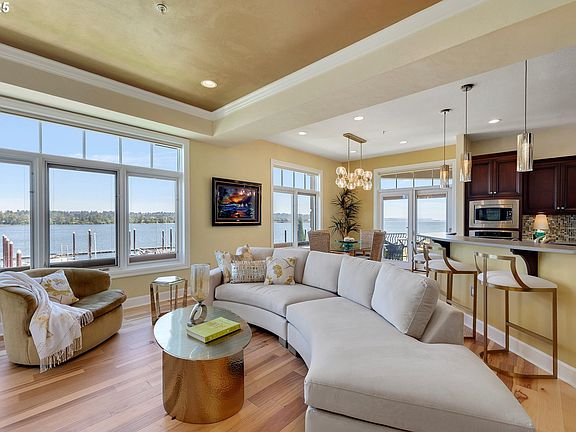 A truly captivating riverfront residence at The Waterside Condominiums! Perfectly positioned on the coveted rivers edge, this stunning unit offers the best views of the river — enjoy unobstructed panoramic scenery of the Columbia River East & West, the marina, bridges, and even Mt. Hood & Mt. St. Helens. Designed to feel more like a home than a condo, it features 2 spacious bedrooms, 2 full baths plus a versatile den for an office or guest space. Inside, a thoughtfully designed open floor plan is flooded with natural light through walls of windows that frame the breathtaking views. The gourmet kitchen is ideal for entertaining, flowing seamlessly into the dining and living areas with soaring ceilings that create an airy, sophisticated feel. The primary suite is a serene retreat with its huge spa-like bath, soaking tub, walk-in shower, and generous vanity. Second bedroom has a wonderful Juliet balcony. Every room connects you to the river — step out onto the large covered patio and watch sailboats drift by, ships pass, and sunsets sparkle across the water. Waterside is a true boater’s paradise, with potential marina slips available just steps away. Stroll along miles of scenic riverfront walking and biking paths, or venture across the River to the vibrant Vancouver Waterfront with trendy dining, boutique shops, and local several wine-tasting rooms, just a mile away. You’ll love the easy access to I-5, downtown Portland, and PDX airport. This secure, gated community also offers two dedicated gated garage parking spaces, a private storage unit, and an on-site workout room too. Enjoy peace of mind, luxurious finishes, and the tranquility of riverside living. Whether you’re sipping your morning coffee watching the sunrise or hosting an al fresco dinner on the veranda, this is your private oasis on the Columbia. Don’t miss this chance to own one of the best-located units in Waterside. Schedule your private tour today — you won’t be disappointed!