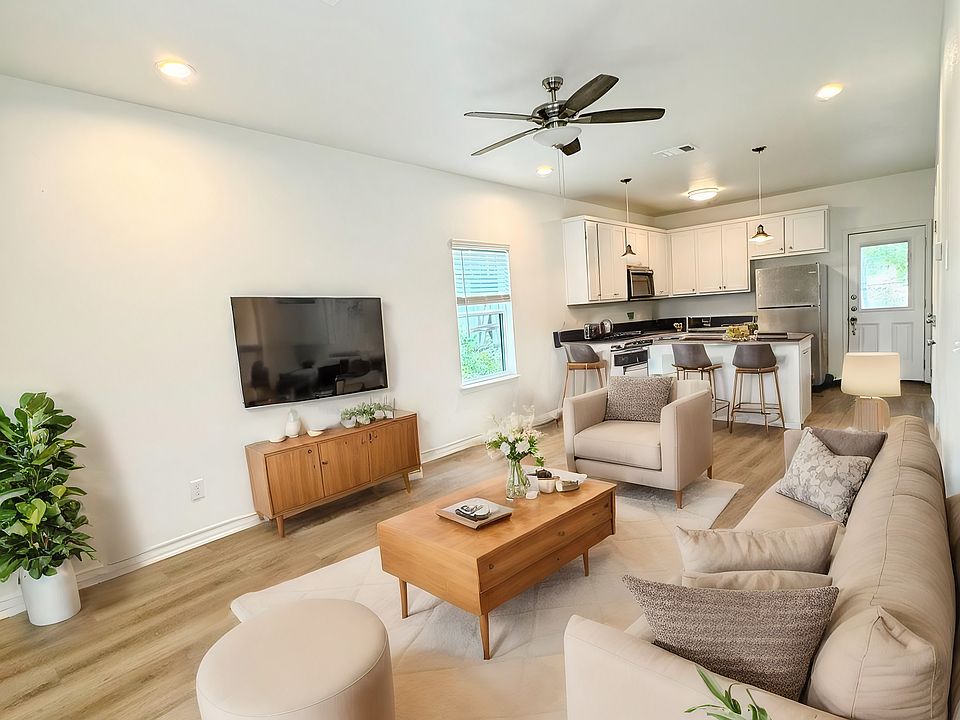 -Open Living Area: As you enter through the front door, you'll be welcomed by a spacious living area that flows seamlessly into the dining room and kitchen.
