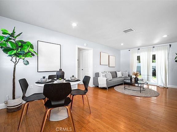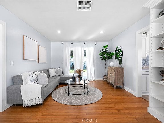 This well-maintained single-story home in a quiet Fullerton neighborhood offers 4 bedrooms, 2 bathrooms, and 1,157 sq.ft of living space. Set on a peaceful interior street, the home features excellent curb appeal with a new vinyl fence, beautiful landscaping, and a roof that's only 4 years old. Inside, the open floorplan connects the living room and kitchen, creating a spacious, inviting space. The kitchen has been thoughtfully updated with white shaker cabinets, sleek quartz countertops, a marble hexagon backsplash, and stainless-steel appliances, including a gas range, microwave, and dishwasher. Additionally, this Home is loaded with modern upgrades such as smooth ceilings, recessed lighting, and bamboo flooring throughout the living areas. Many rooms have plantation shutters, and dual-pane windows let in plenty of natural light. The primary bathroom has a walk-in tile shower, upgraded vanity, and fixtures. The guest bathroom is equally stylish with a hexagon tile shower, new vanity, fixtures, and a tub/shower combo. The three additional bedrooms are roomy and well-lit, each offering plenty of closet space. The backyard is a standout feature, with a large, covered patio perfect for entertaining, plus a storage shed and extra parking. The detached garage is just steps from the patio and could easily be used for parking or additional space for entertaining. Laundry is conveniently located in the garage. This home also comes with a new HVAC and ducting system, and it is located near the 91 and 5 Freeways, as well as shopping, parks, and major attractions like Knott’s Berry Farm and Disneyland.