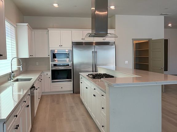 - Gourmet kitchen featuring quartz countertops, a massive island, stainless steel appliances, and a walk-in pantry