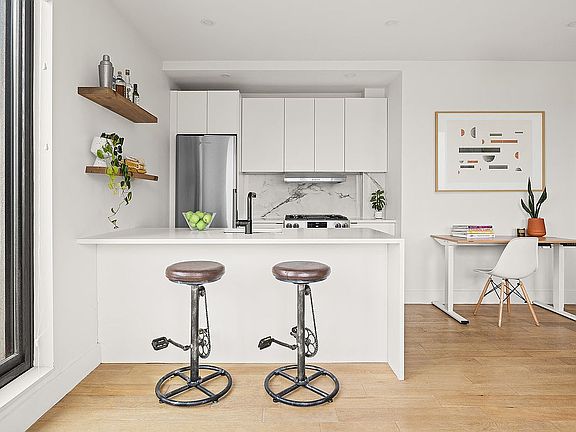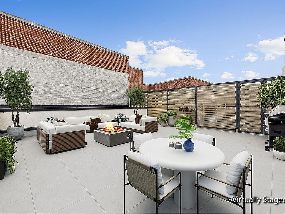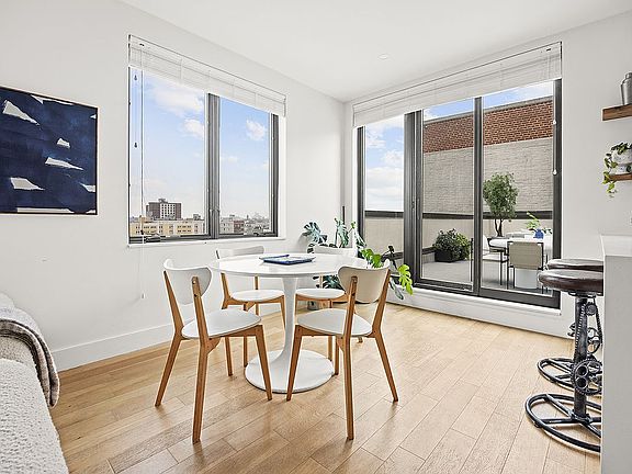 Apt 6A is a loft-like space with tall ceilings, an open living / dining / kitchen "great room," and easy access to your exclusive terrace with over 600 s.f. of private outdoor space to enjoy. The terrace and apartment are graced with endless open sky and Brooklyn views, plus abundant natural light. The kitchen is chic and functional, offering a white stone peninsula with waterfall counters, a top-notch appliance package and and sleek cabinetry. You'll also find a generous primary bedroom with large walk-through closet, dramatic en-suite bathroom with double sinks, and a step-in shower. Other features include a powder room, central air and heat, and in-unit laundry. Located in happening Bed-Stuy, with G and JMZ trains nearby, and lots of cafes, bars and restaurants to choose from.