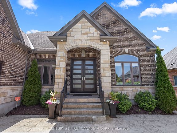 Executive 2+2 bedroom bungalow with sprawling walkout basement backing onto forested greenspace! *Nearly 4,000 sq. ft. of finished space *Grand 10 and 12-ft ceilings, oversized windows, natural light galore *Striking stone + brick exterior with courtyard-style garage *Glass-railed staircase, hardwood floors, crown moulding *Chefs kitchen with granite counters + espresso cabinetry *Primary suite with spa-like ensuite + custom walk-in closet * Finished lower level: theatre room, wet bar, games lounge *Massive rear balcony with glass rail + fenced yard *Separate lower-level entry for in-law or guest potential. Turnkey, timeless, and tucked into one of Lambeth's most coveted streets. Nearby shopping, restaurants and easy highway access.