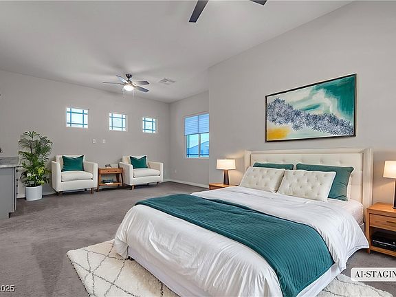 Huge Price Reduction+ Solar Paid Off Through Escrow! Enjoy energy savings with this stunning single-story 5-bed, 4-bath Next-Gen home in the gated Elkhorn Estates of Centennial Hills. Perfect for multigenerational living or guests, the private Next-Gen suite has its own entrance. The gourmet kitchen features granite counters, built in stove top, backsplash, oversized island, pot filler, stainless steel appliances, and R/O system. All appliances included. Upgrades include granite counters in kitchen & every bathroom, plantation shutters, custom shades, coffee bar plumbed for a sink, surround sound, and epoxied garage floors. The primary suite offers spa-like luxury with dual vanities, soaking tub, and walk-in shower. Step outside to a spacious .24-acre backyard with covered patio, lush landscaping, and plenty of room to build a pool. Move-in ready with all the modern touches you’ve been searching for!