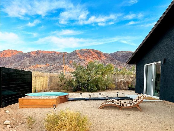 Tucked into the foothills of Joshua Tree National Park, this fully furnished 3-bedroom, 2-bathroom home blends modern design with natural beauty. Situated on a fully fenced 0.41-acre lot with panoramic mountain views and added privacy from surrounding open parcels, this stylish retreat also includes the adjacent lot (APN: 061616203), offering even more space and future potential. Currently a high-performing short-term rental, this turnkey property features a sun-drenched living room and a custom-designed kitchen with a large island and ample storage—ideal for both entertaining and everyday living. Design details include tambour wood finishes and sleek black accents throughout. The primary suite offers direct access to the backyard, a king-size bed on a redwood platform, and a spa-like ensuite with rainfall shower, charcoal ceramic tile, antique brass fixtures, and a skylight. Two additional bedrooms and a second full bath provide comfort for guests or family. Outdoor highlights include an 8-ft cowboy pool, hot tub, fire pit, BBQ/dining area, covered lounge, and hammocks—perfect for relaxing or stargazing under the desert sky. Additional amenities include a two-car garage, central AC/heat, evaporative cooler, and a fully fenced yard suitable for pets and kids. Located just 5 minutes from Kitchen in the Desert, the farmers market, and casino, 8 minutes to the National Park entrance, 10 minutes to the Marine Base, and 15 minutes to downtown Joshua Tree. This is a popular income property with limited availability to show due to high demand—join us for an open house on June 21st to experience this desert gem in person. We’d love to welcome you! Ideal for investment, full-time living, or a weekend retreat—don’t miss this opportunity to own a prime piece of the desert.