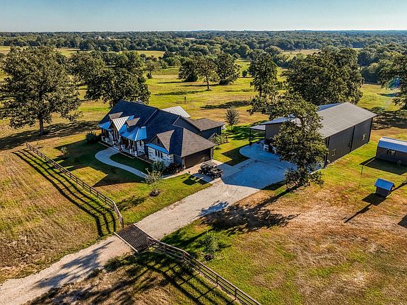 Stunning 45-Acre Ranch with Panoramic Views, Majestic Oaks & Custom Home + Shop with Guest Quarters! Nestled on nearly 45 private acres, this breathtaking property offers sweeping views, mature oaks, wildlife galore, a stocked pond with giant catfish, and endless possibilities. Whether you're looking for a peaceful homestead, ranching paradise, or a place to work and play, this one-of-a-kind property has it all. The heart of the ranch is a beautifully crafted 3/2.5 custom-built home, designed for comfort and style. With quality finishes throughout, the home features an open floor plan, spacious kitchen, cozy living area, giant walk-in butler's pantry, and large windows that bring the outdoors in. Relax on the covered porches while taking in stunning sunrises, sunsets, and the natural beauty that surrounds you. Another standout feature is the large 1/1 barndo guest quarters within the metal framed shop that is perfect for hobbies, projects, or storage. Schedule your showing now!