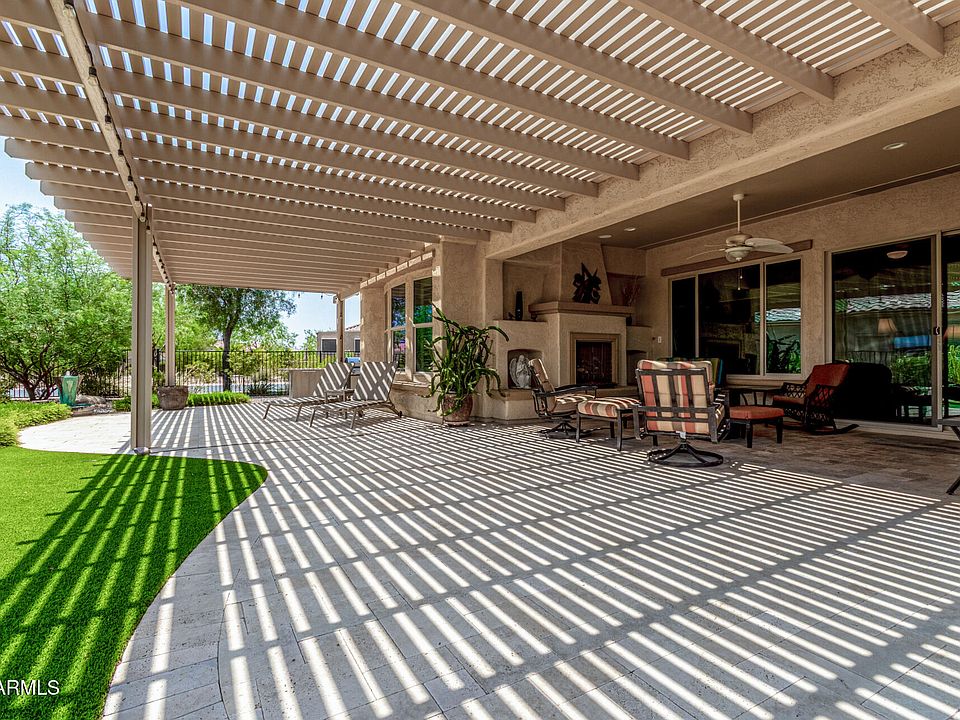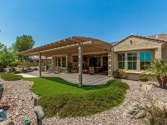 EXPLORE INSPIRED RESORT LIVING! Welcome to this beautiful Pursuit w/ GOLF COURSE VIEWS from the amazing, travertine ext. patio w/ pergola, gas fireplace, water fountains & grill area. Enjoy cooking/entertaining in the open kitchen w/granite counters, pull-out shelves, gas cooktop, 4 y/o stainless appliances, tile b-splash, staggered cabinets & pendant lights. Relax in the Primary suite w/ bowed windows, shower w/ bench & spacious closet. Hi-lites include 18'' designer tile, Plantation Shutters, wet bar, amazing security door w/screen+glass, Airwave purifying system & ext. laundry w/cabinets & sink! PLUS, 4-Ft extended garage w/epoxy floors, insulated garage door, cabinets & service door to outdoor garbage corral. PREPAID SOLAR lease saves $$$! Furniture is negotiable! PAID TOF BOND! Sun City Anthem at Merrill Ranch offers a 48,000 SF recreation center w/ craft rooms for quilting, pottery, glass works, jewelry & crafts, spacious ballroom w/ stage for dancing, theatrical productions, concerts & more. PLUS full gym, work out rooms, indoor lap pool & spa, walking track, cafe area, card rooms, poker tables, pool table, ping pong table, business center, class room for interesting seminars! Troon Poston Butte Golf Course is one of the nicest in the area. Sun City offers Pickleball, Tennis, Bocce Ball, Horseshoes, Shuffleboard, clubs for all activities.......LIVE WHERE THE SURROUNDINGS DELIGHT, INSPIRE & CHALLENGE YOU!