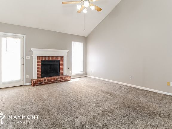 This brick-front home welcomes you with curb appeal and a functional layout designed for comfort. Step inside to find fresh interior paint and light-filled rooms that create a warm and inviting atmosphere. The living room offers a cozy focal point with a brick surround and mantle, while large windows and vaulted ceilings add a sense of openness.
