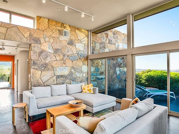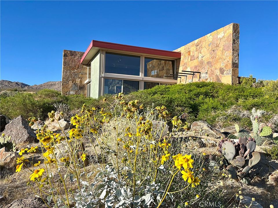 Villa Bajada—A Timeless Architectural Retreat in South Joshua Tree. Perched high near the Joshua Tree National Park boundary, on two contiguous parcels totaling 4.23 acres. Live with nature in this superb mid-century style modern gem while creating your personal studio for art, music, meditation, and entertainment. The main house is a 2007 built 1181 square foot 2-bedroom, 1 bath home with kitchen, dining room, living room, garage and features paid solar panels to reduce utility costs. Nearby the home, an unfinished 1108 square foot building flex space / art or yoga studio, featuring central HVAC, bathroom, another room and garage, plus in-ground pool—an opportunity to complete to taste with the original contractor still available and permit active. Surrounding the home, multiple patios and lush native landscaping create outdoor living spaces including a spa for moonlit dips and stargazing. This unique pied-à-terre makes a fantastic vacation getaway or a full-time residence or income / rental property. Rarely does a property of this vision come available. Villa Bajada is more than a home—it’s a living piece of art. Come experience this rare desert refuge now.