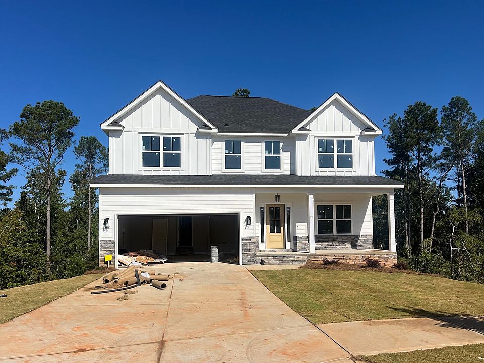 The Lansing Basement Plan by Oconee Capital offers 6 bedrooms, 4 bathrooms, and 3,559 square feet of well-designed living space. A welcoming rocking chair front porch leads into a spacious foyer with a formal dining room. The open-concept kitchen features a large island, abundant cabinet storage, and overlooks the great room with an electric fireplace—perfect for gatherings.